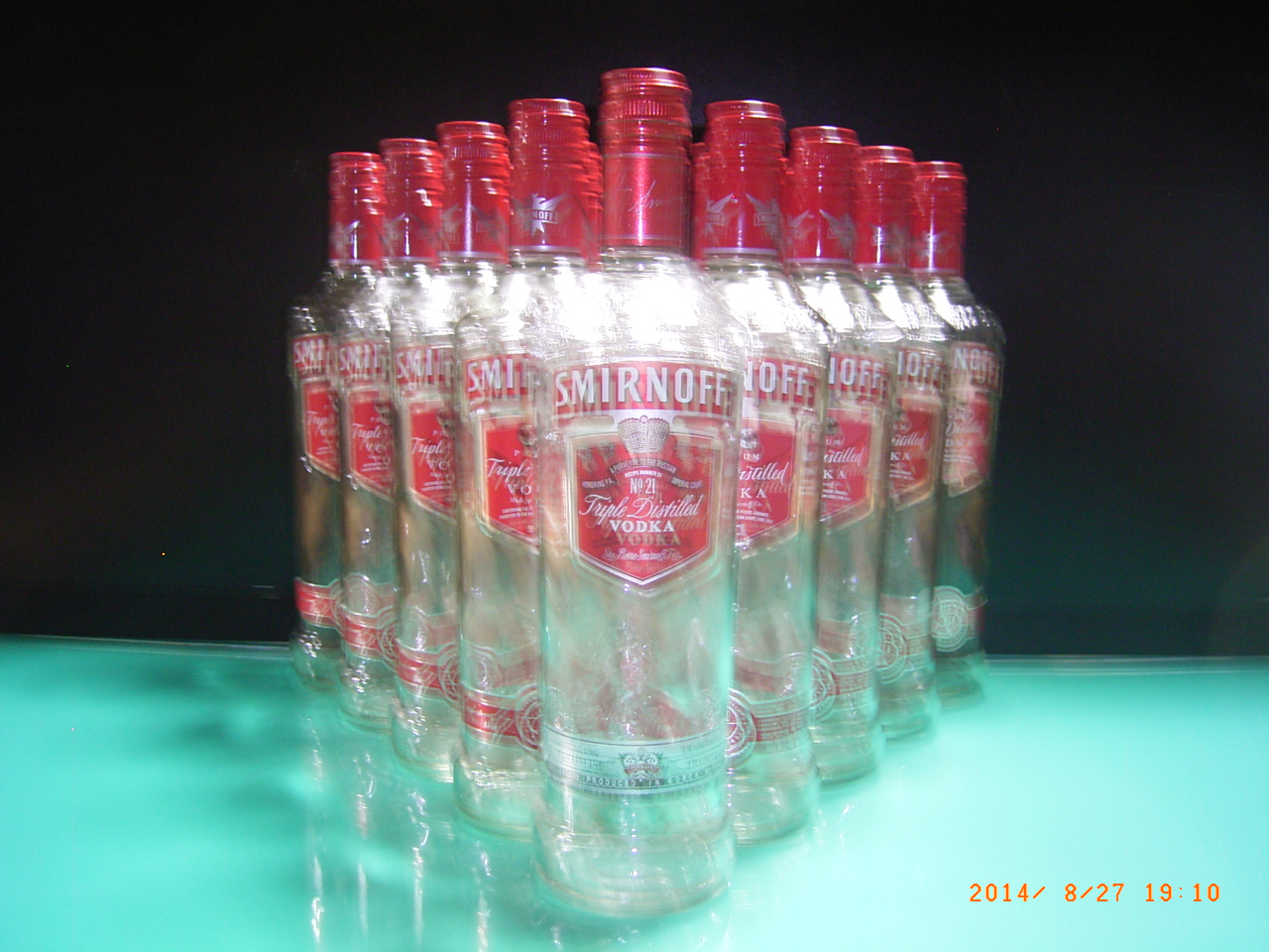 何かに使えるのかな、と思って取っておいた「スミノフ SMIRNOFF」(ウォッカの銘柄の一つ)の空き瓶。