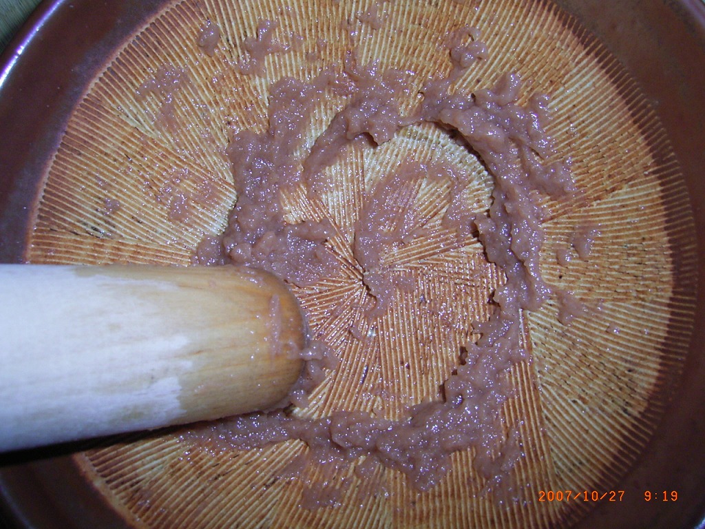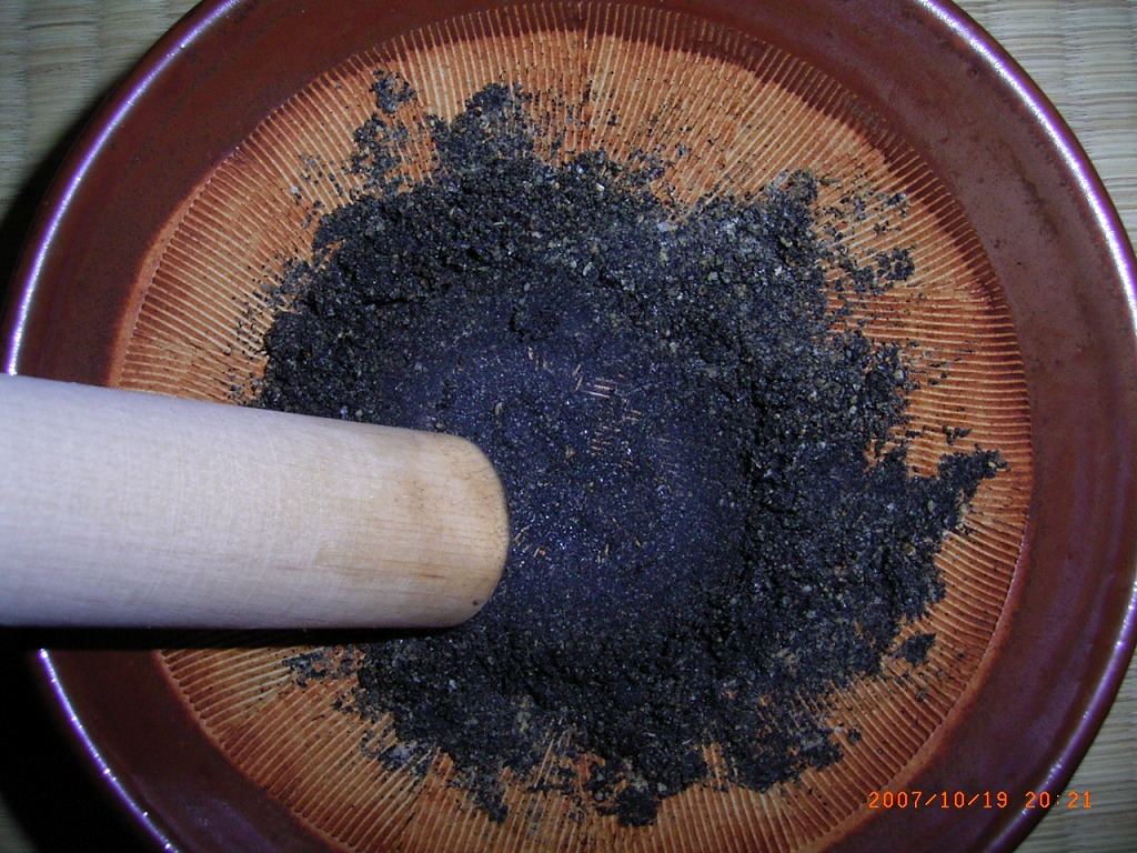 - 胡麻油、塩を加えて、更に擂り潰します。