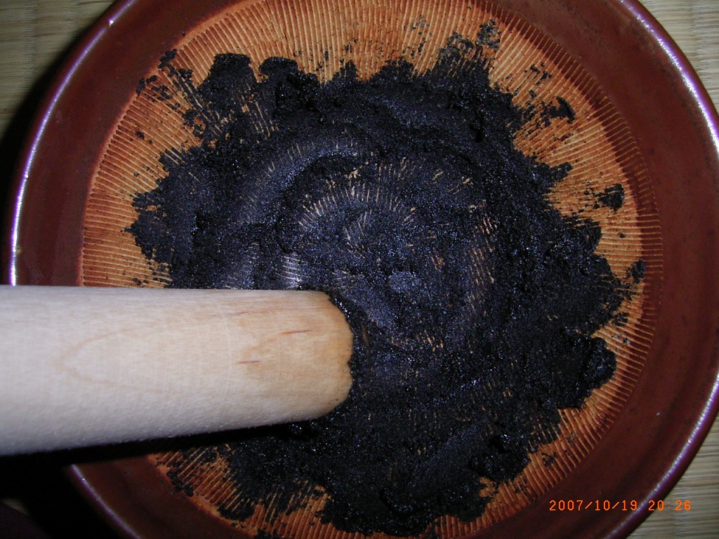 - 狐色になって来たら擂り鉢に移し、よく擂り潰します。