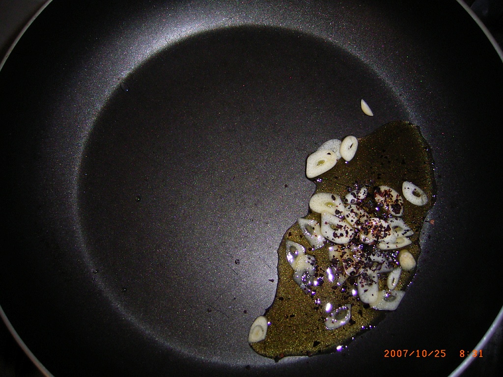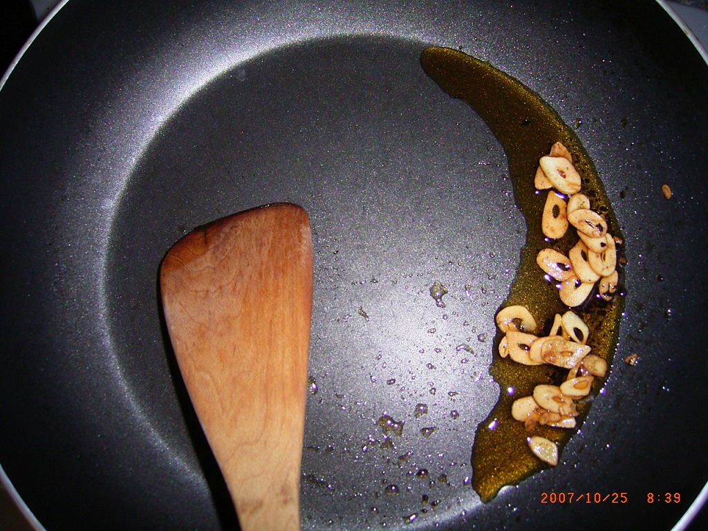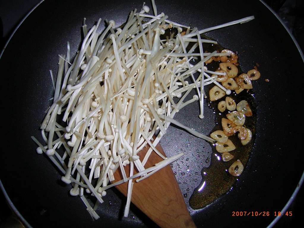 にんにくを揚げる時、最後に榎茸を加えて、軽く炒めるだけです。