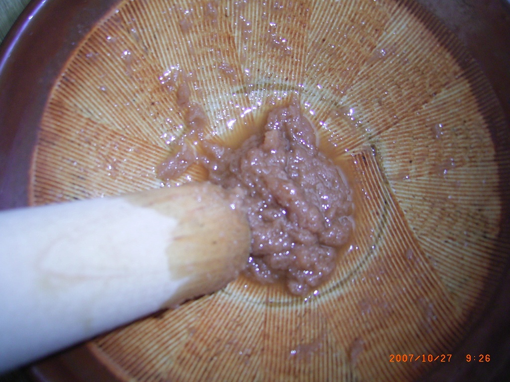 - 梅干を擂り鉢でよく擂り潰します。