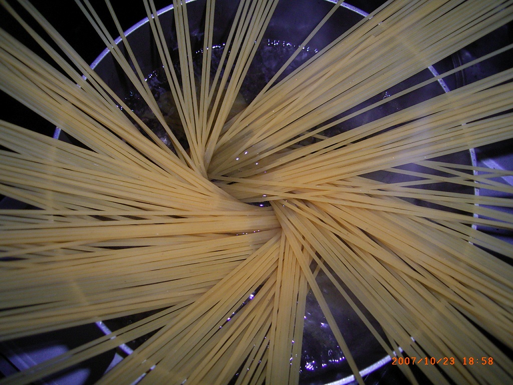 - スパゲッティは、両手で持って、少し捻りながら、鍋の真ん中に立てるように入れると、綺麗に放射状に広がります。