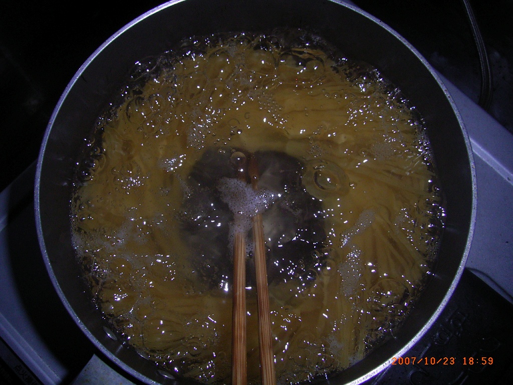 - スパゲッティを湯の中に沈め、湯が吹き零れない程度の火加減で茹でます。