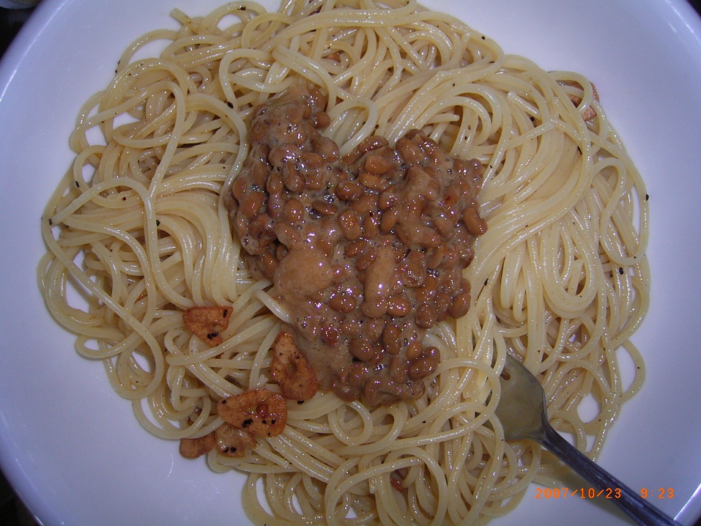 アーリオ・オーリオ・ペペロンチーノの上に、納豆を付属のたれと一緒に掛けても美味しいです。