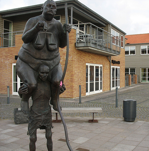 Survival of the fattest on Flickr - Photo Sharing! 天秤を持つ太った女性が痩せた男性に肩車されているこの像は、上の女性が先進国を表していて、その肥満体が先進国の富裕を、手に持つ天秤が先進国の振り翳す正義を表し、下の男性が途上国を表していて、その痩身が途上国の貧困を表しているそうです。 |